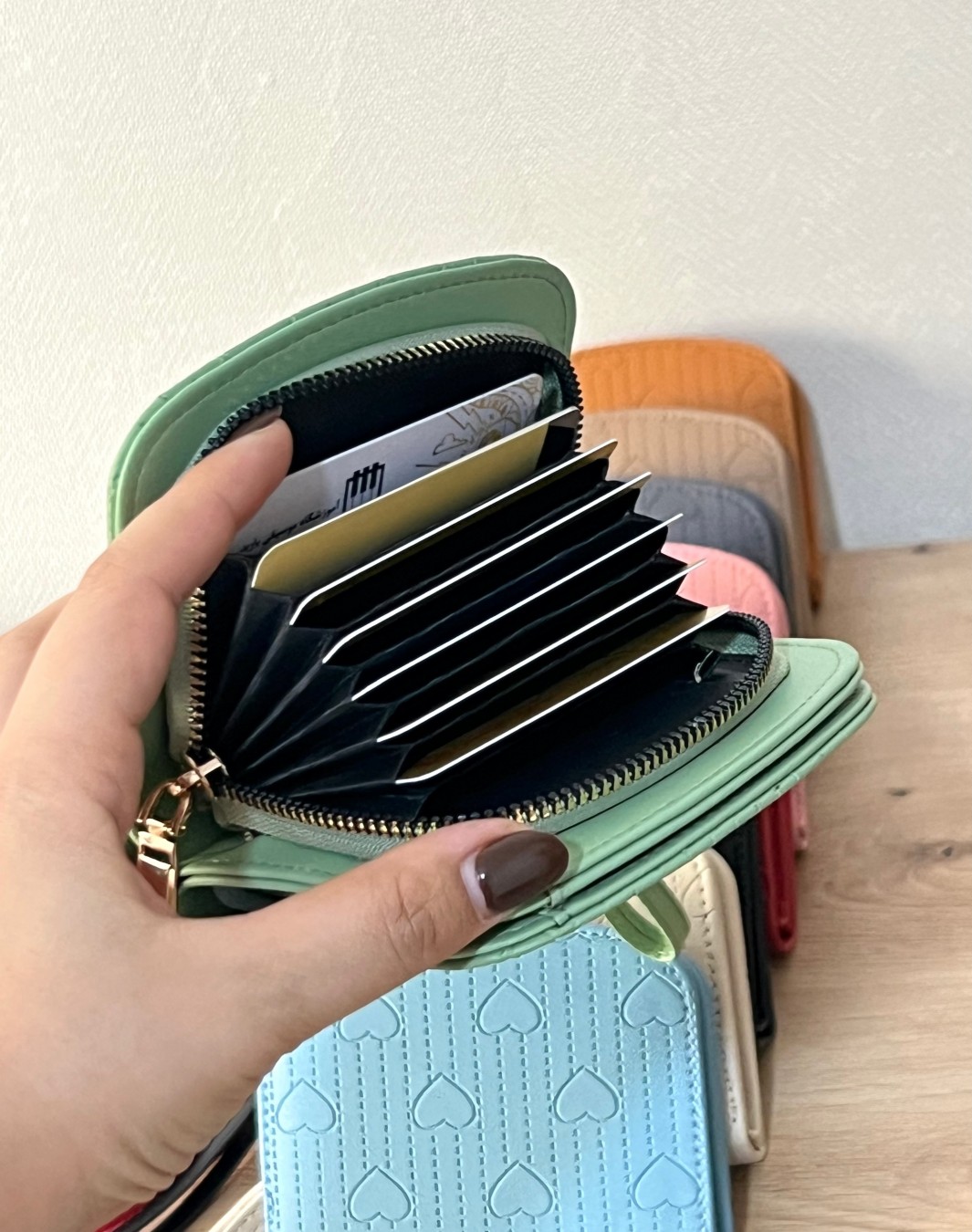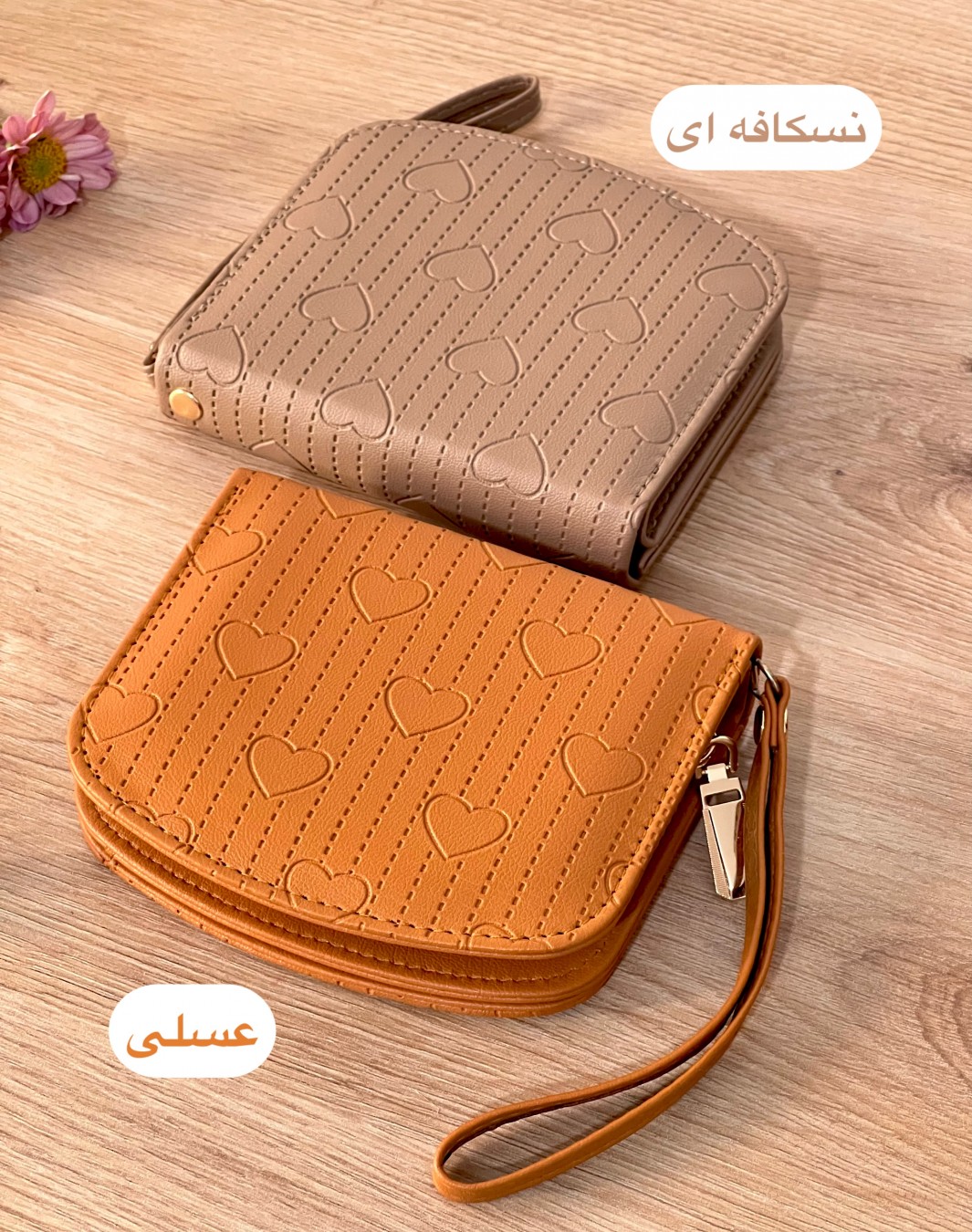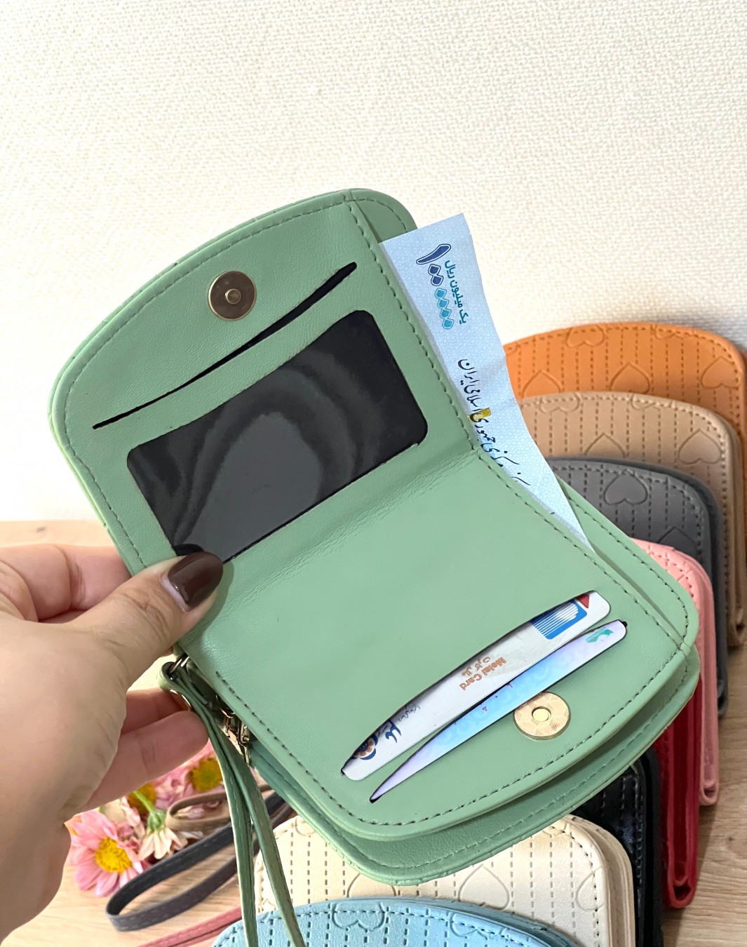 دارای ۸ عدد جای کارت در قسمت زیپ و جای اسکناس و در قسمت جلوی کیف جای عکس و دو عدد کارت بانکی می باشد.