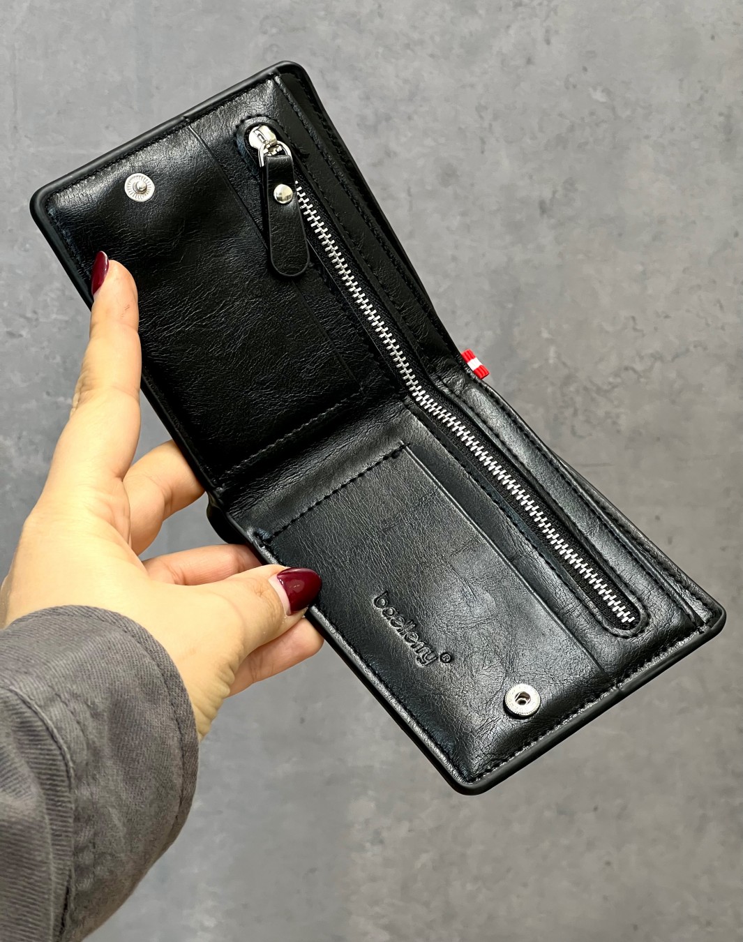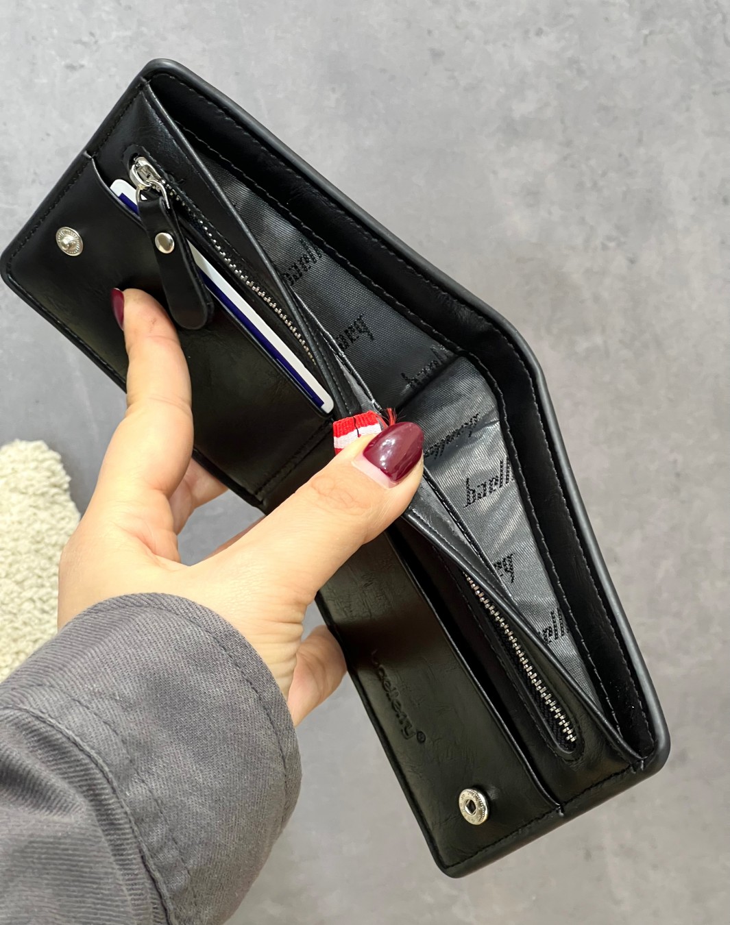 دارای 7 جا برای کارت شناسایی و بانکی ,جای اسکناس و یک زیپ در قسمت داخلی کیف می باشد.