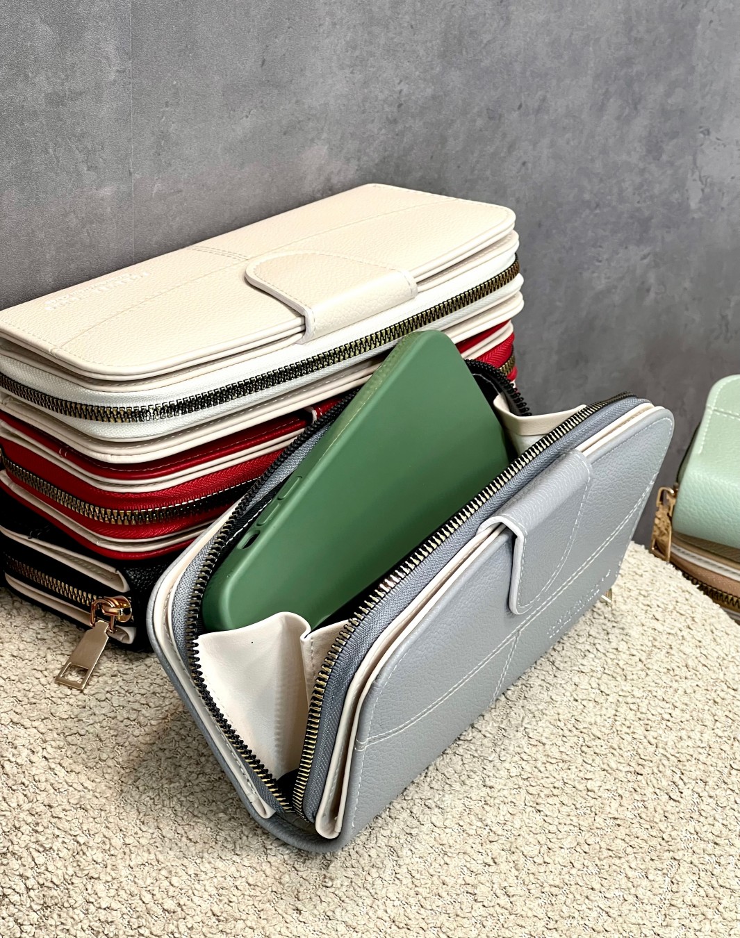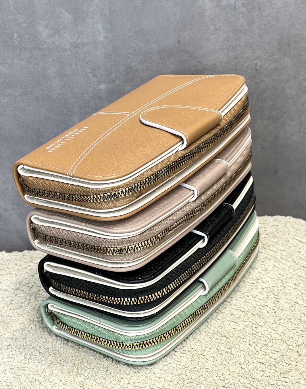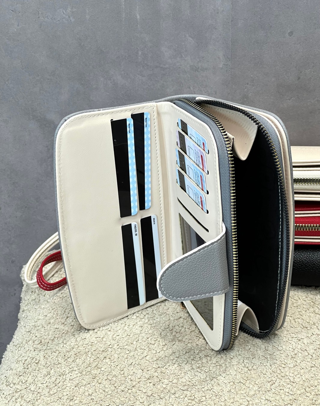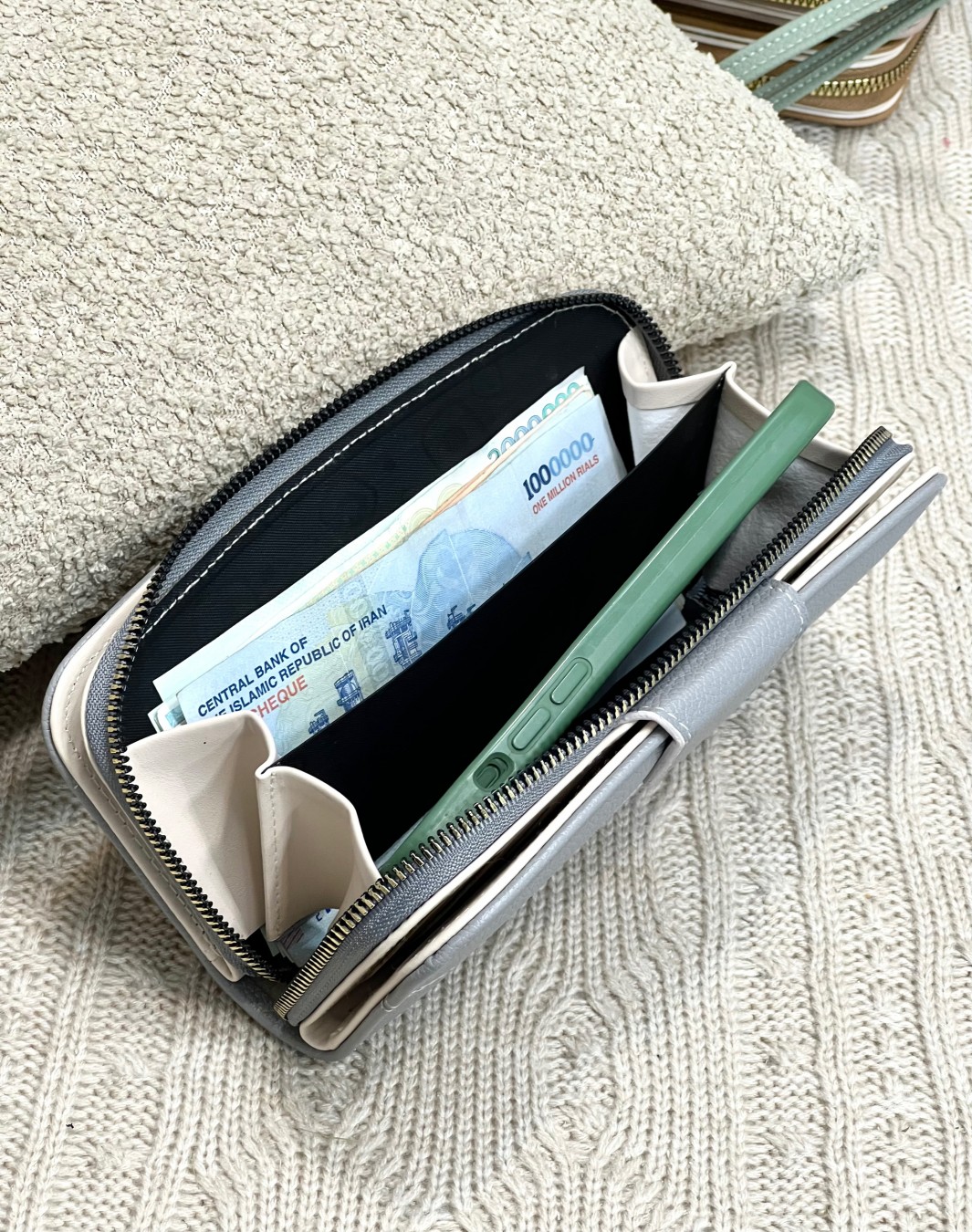 تعداد خانه و زیپ:سه فضای جدا و دارای 18 جای کارت،جای اسکناس،موبایل،عکس می باشد.